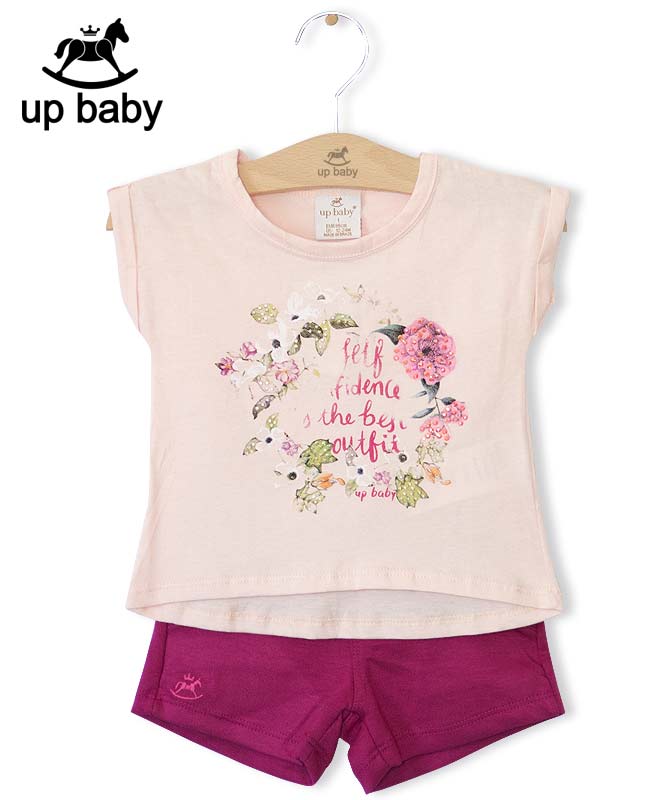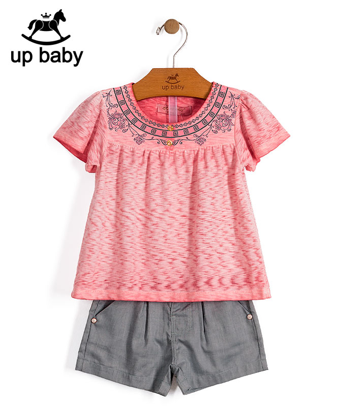 【UP BABY】女の子Tシャツ&ショートパンツセット【子供服・デイリー・お出かけ着にも】ボタニカル刺繍|ピンク×グレー