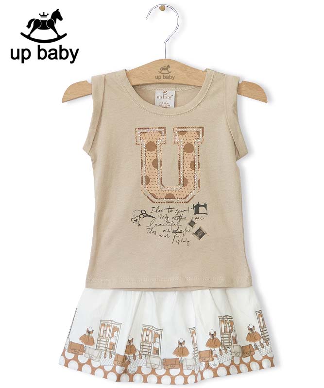 【UP BABY】女の子タンクトップ&スカート【内側ズボン付き・おしゃれ】ラインストーンロゴ|ベージュ×ホワイト