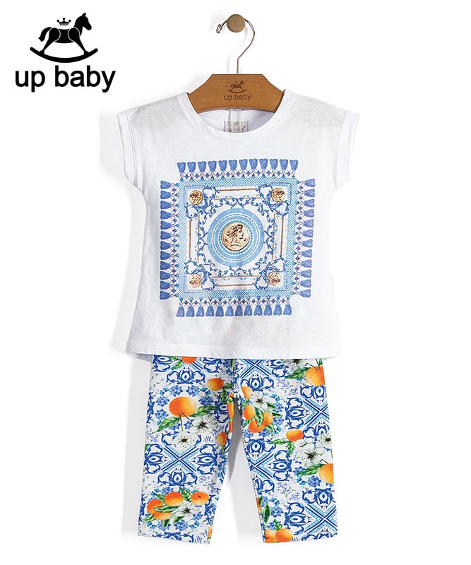 【UP BABY】女の子Tシャツ&レギンスセット【子供服・デイリー】アラベスクグレカ柄|ホワイト×ブルーマルチ