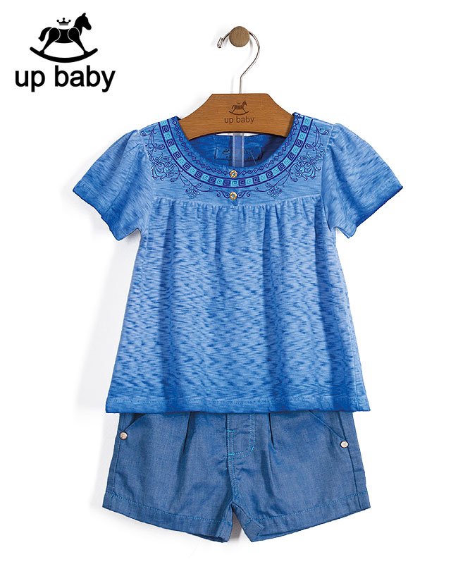 【UP BABY】女の子Tシャツ&ショートパンツセット【子供服・デイリー・お出かけ着にも】ボタニカル刺繍|ブルー×ネイビー