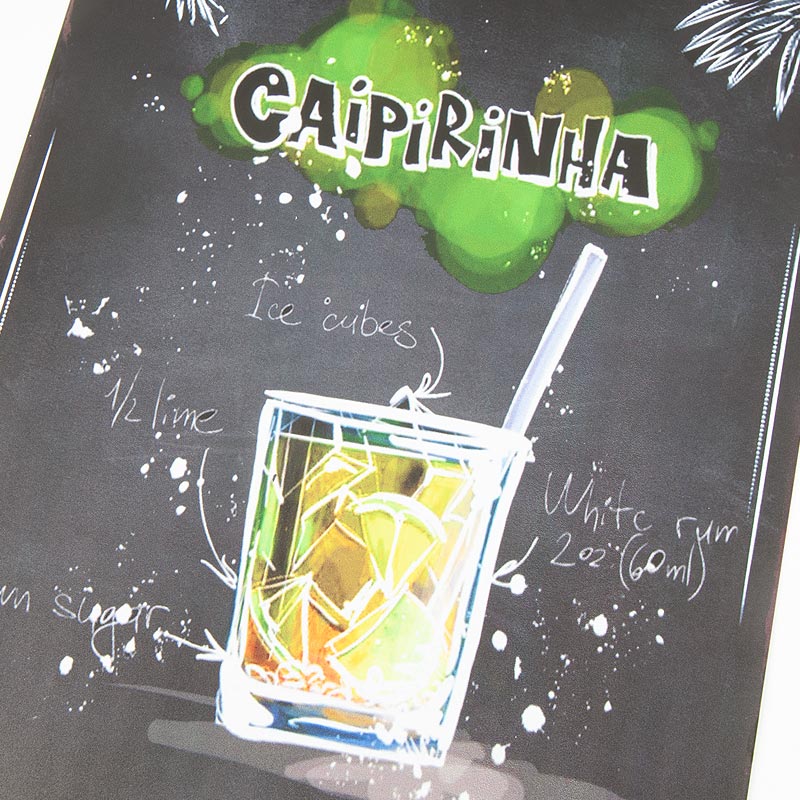 ブラジルの美味しい名物カクテル、カイピリーニャがデザインされた看板です。ブラックボードに描かれたチョークアート風のデザインがお洒落なカフェの雰囲気を演出!壁に飾ったり、立てかけたりとインテリアとして楽しめる、ブラジリアンなアイテムです。