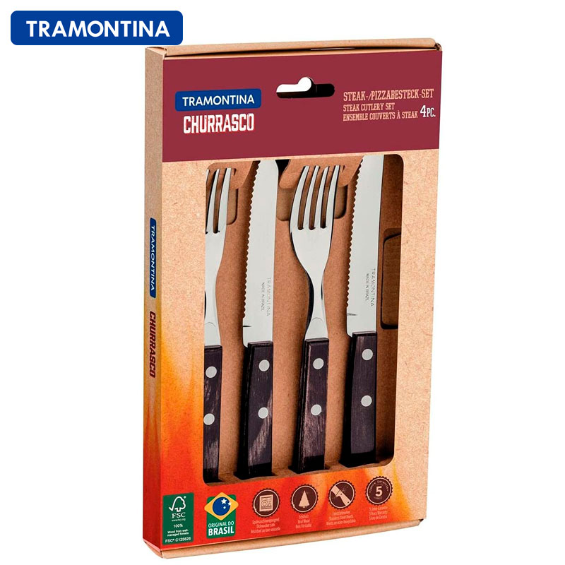 ブラジルのナンバーワンテーブルウェアブランド、トラモンティーナのステーキナイフ2点&フォーク2点の4点セットです。シュラスコの本場ならではの切れの良いステーキナイフは、普段使いのお食事にも大変便利です。切れにくいお肉はもちろん、お野菜なども簡単に切り分けることができます。一度使うと他のテーブルウェアが使えなくなるほど愛用者続出のナイフ&フォークセットです。※食洗器対応