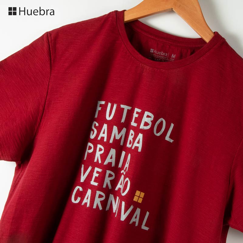 ブラジル、リオデジャネイロ発のカジュアルウェアブランドHuebra(ウエブラ)のポルトガル語フレーズTシャツです。サッカー、サンバ、ビーチ、夏、カーニバルと、リオならではのフレーズがデザインされたTシャツ。落ち着いたレッドカラーがお洒落です。
