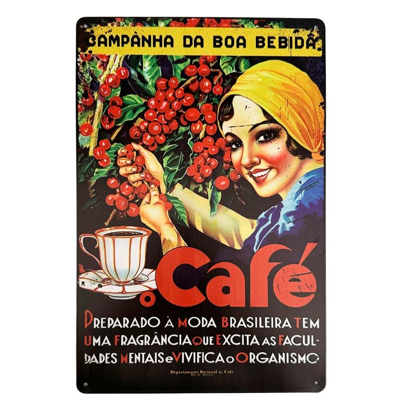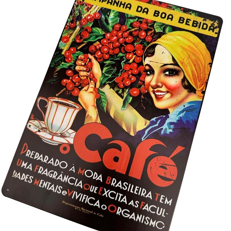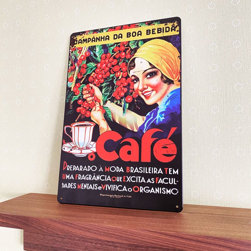 レトロな雰囲気がお洒落なコーヒー摘みデザインの看板です。インテリアとして立てかけたり壁に飾ったりして良き空間を演出するパネルです。ポルトガル語のレタリングも相まってブラジルの雰囲気抜群なデザインのアイテムです。