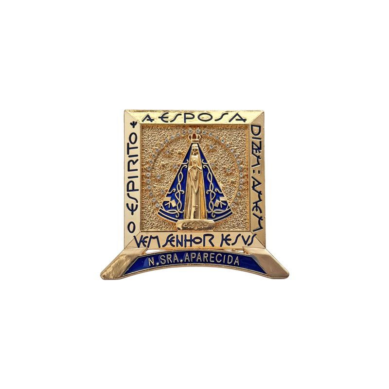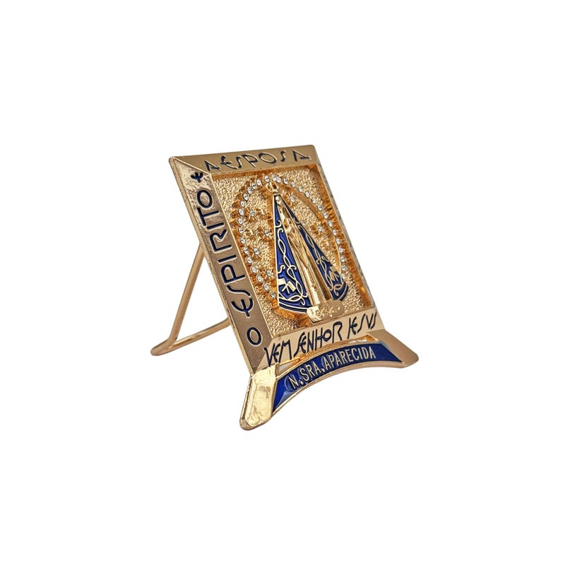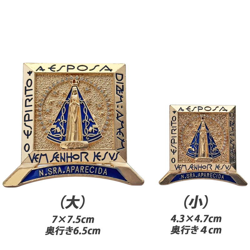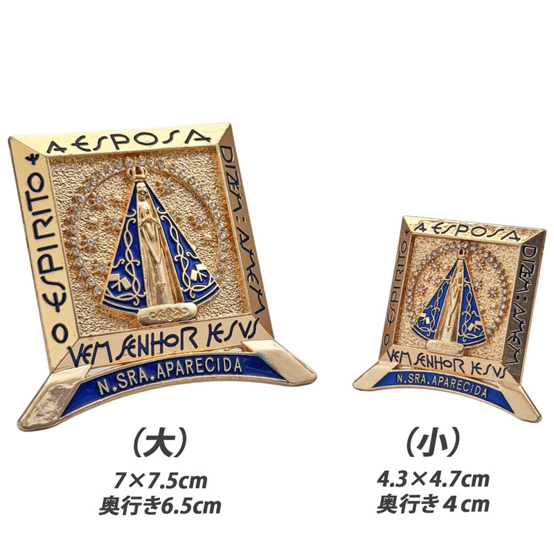 ブラジルの褐色のマリア様、ノッサセニョーラアパレシーダ(NOSSA SENHORA APARECIDA)のゴールドオブジェです!光輝くラインストーンとブルーのマントを羽織ったアパレシーダが神々しい印象の立てかけタイプの置物です。奥行4cm程度なので飾り棚やちょっとしたスペースに置いて飾れる小さめなサイズ感のお守りインテリアです。大切な人へのギフトにもおすすめです!