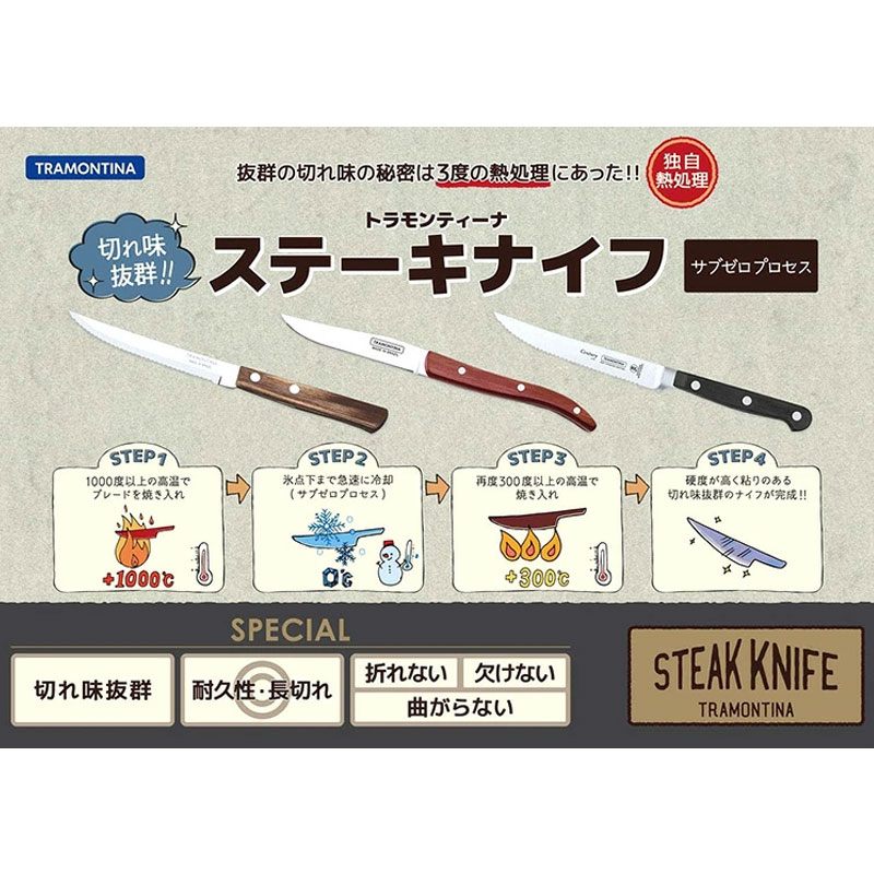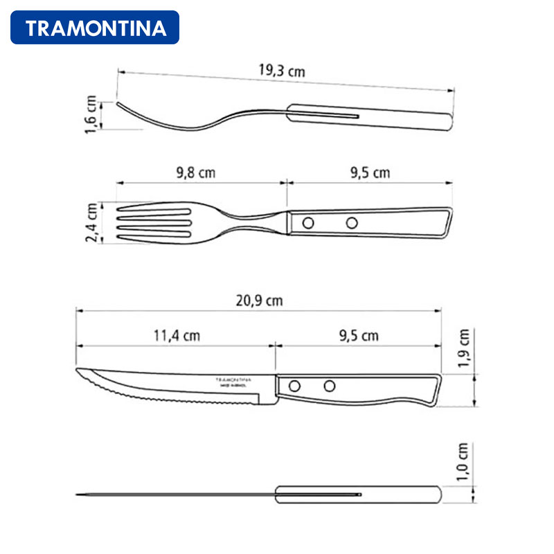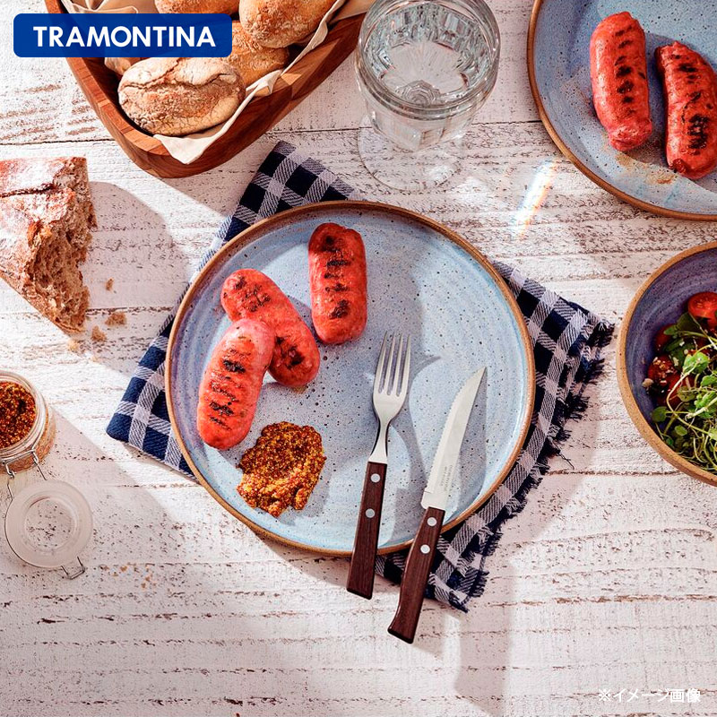 ブラジルNo.1テーブルウェアブランド、トラモンティーナのステーキナイフ6点&フォーク6点の12点セットです。シュラスコの本場ならではの切れ味の良いステーキナイフは、普段のお食事はもちろん、シュラスコ・BBQ、パーティーやアウトドアシーンにも大変便利です。切れにくいお肉はもちろん、お野菜なども力を使わずに簡単に切り分けることができます。一度使うと他のテーブルウェアが使えなくなるほど愛用者続出のナイフ&フォークセットです。