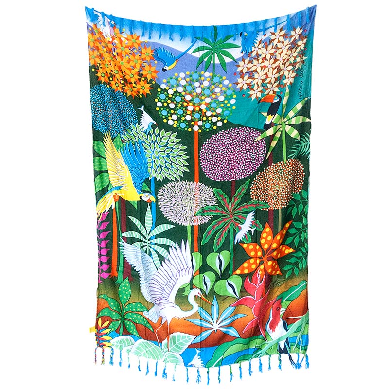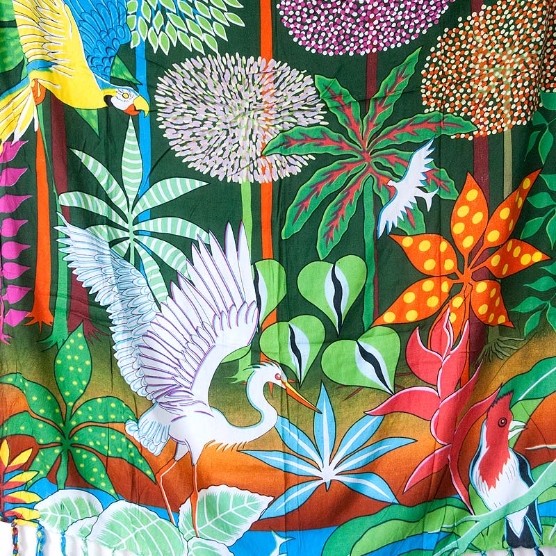パンタナールの湿原がデザインされたブラジルカンガです。大自然と鳥たちが調和した美しい絵! 多用途に使用できるカンガは1枚持っていると便利です!大判で軽いのでレジャーにインテリアに大活躍間違いなしです。