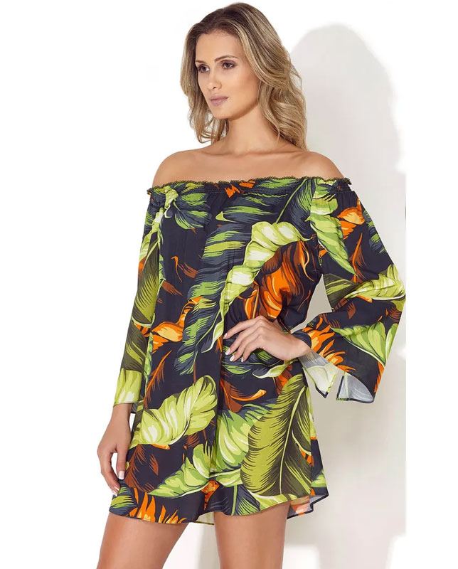 【Morena Rosa】リーフ柄オフショルダーリゾートドレス