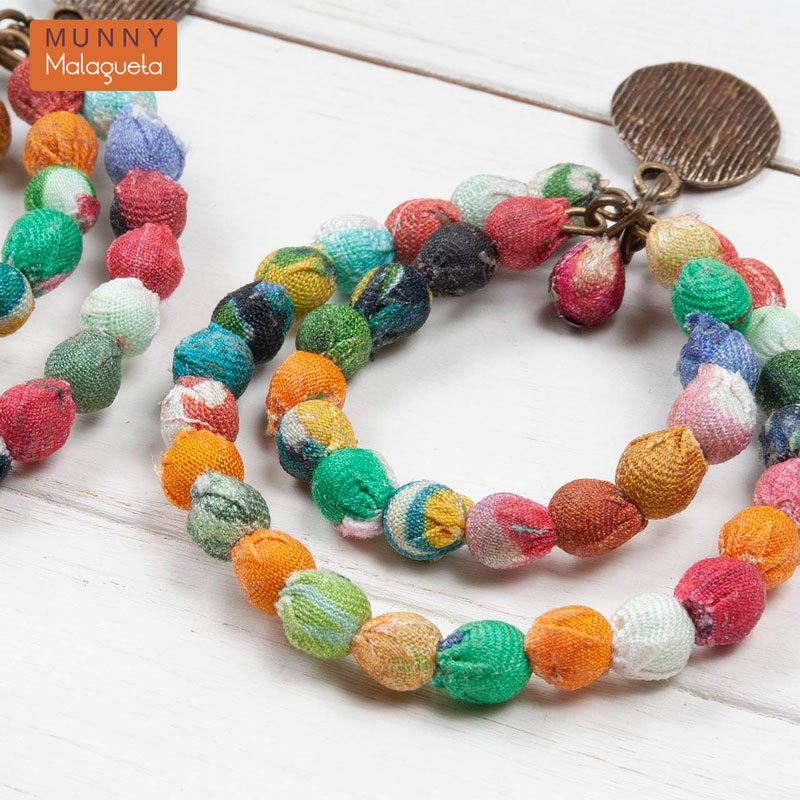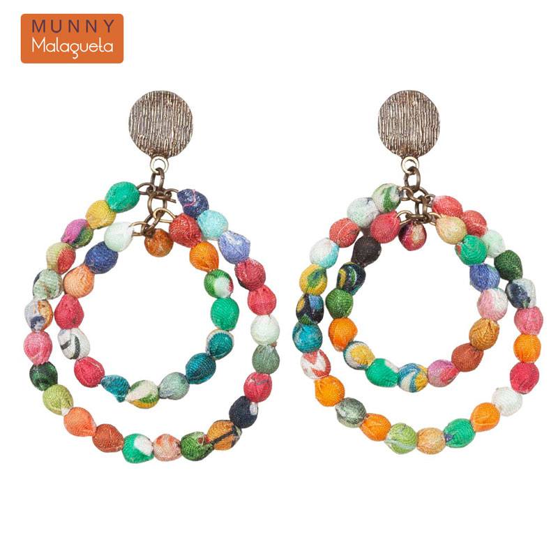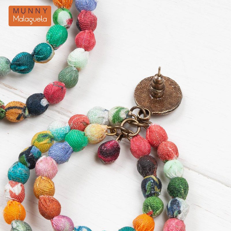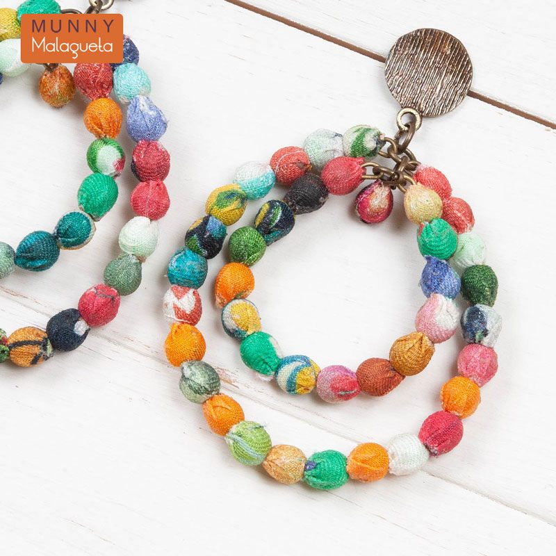 色とりどりのファブリックビーズを贅沢に使ったお洒落なピアスです。サイズ違いの2連のダブルフープが存在感あるアイテム。日本にない珍しいデザインなので、プレゼントにもおすすめです。
