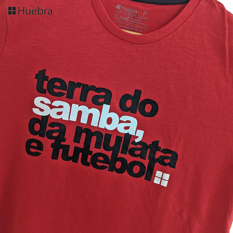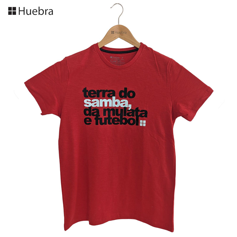 ブラジル、リオデジャネイロ発のカジュアルウェアブランドHuebra(ウエブラ)のポルトガル語フレーズTシャツです。発色の良いビビッドな赤(レッド)Tシャツ。terra do samba, da mulata e futebol(サンバ、小麦肌、サッカーの聖地)とデザインされたお洒落なウエブラのTシャツです。