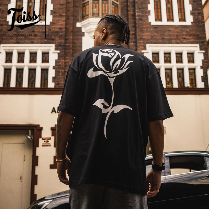 サンパウロ発、ネイマール愛用カジュアルストリートブランドTOISS(トイス)のオーバーサイズTシャツです。背中に一輪の大きなバラの花が咲くデザイン。キャッチーで目を惹く背面と、前面のシンプルさのギャップがお洒落なTOISSのTシャツです。黒地にホワイトローズのコントラストがカッコいいアイテムです。